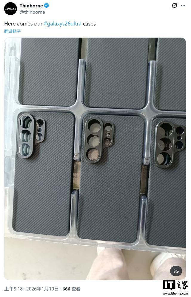 IT之家 1 月 10 日消息,配件厂商 Thinborne 今天(1 月 10 日)在 X 平台发布推文,展示了适用于三星 Galaxy S26 Ultra 的手机壳,揭示了该手机在后置摄像头模组方面的变化。