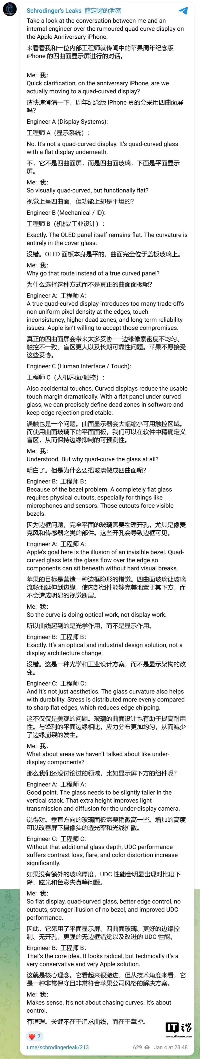 IT之家 1 月 10 日消息,消息源 @phonefuturist 于 1 月 4 日在 X 平台发布推文,分享了一份据称源自三位苹果工程师的 Telegram 对话记录,透露了关于 2027 年苹果“20 周年纪念版 iPhone”的相关信息。