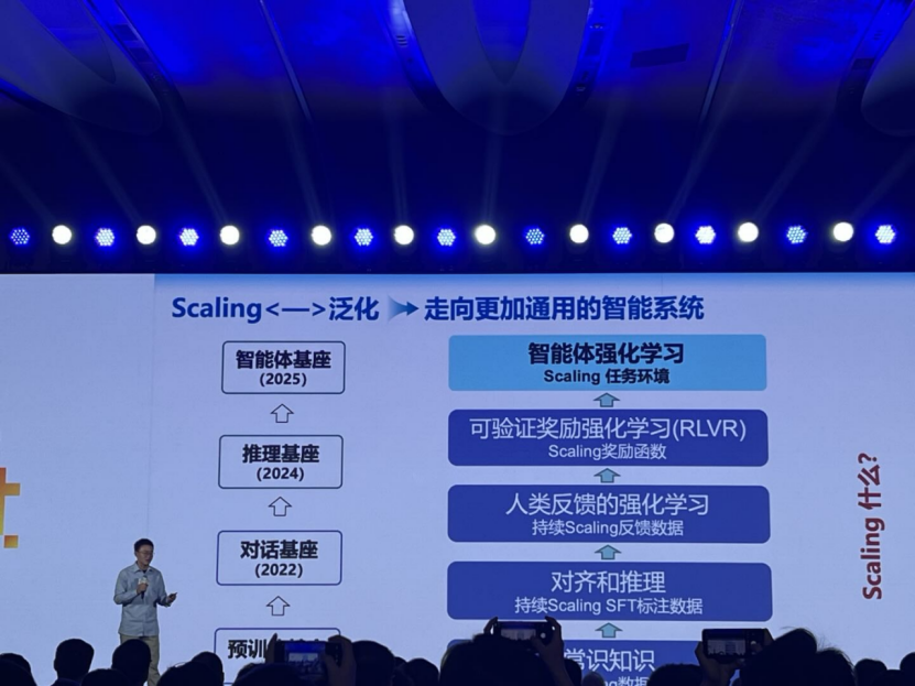 “今年是RLVR(可验证奖励强化学习)爆发年。”谈及Scaling模式的进化,唐杰表示,在RLVR爆发之前,行业内只能通过人类反馈数据来做,但人类反馈的数据中“噪音”也非常多,而且场景也非常单一。“但如果我们有一个可验证的环境,就可以让机器自己去探索、去发现反馈数据,实现自我成长。”
