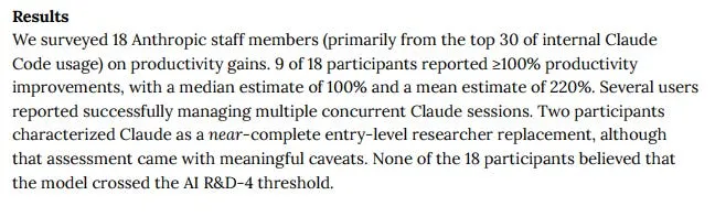 Anthropic的内部调查显示,其Opus 4.5模型已被部分员工视为「近乎完整的入门级研究员替代品」。