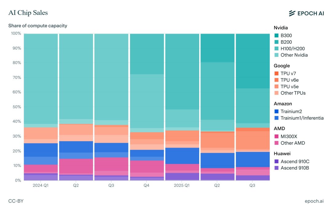 对此,顶级研究机构Epoch AI追踪了全球各大主流芯片设计厂商每个季度的AI加速芯片产量,揭示了这场军备竞赛的底牌。