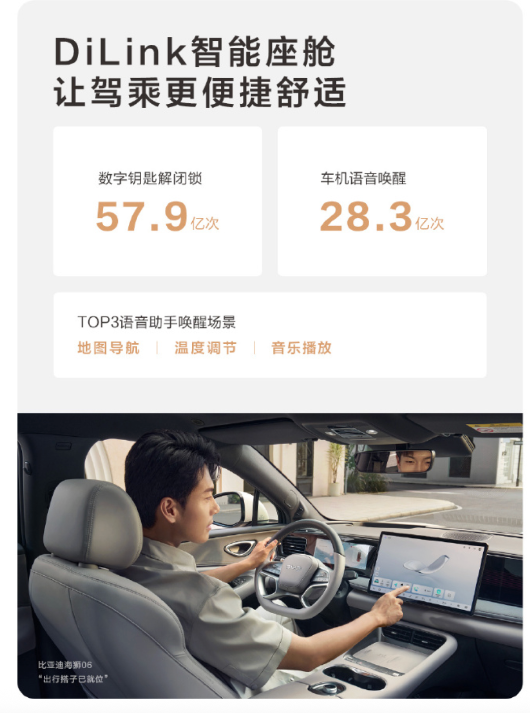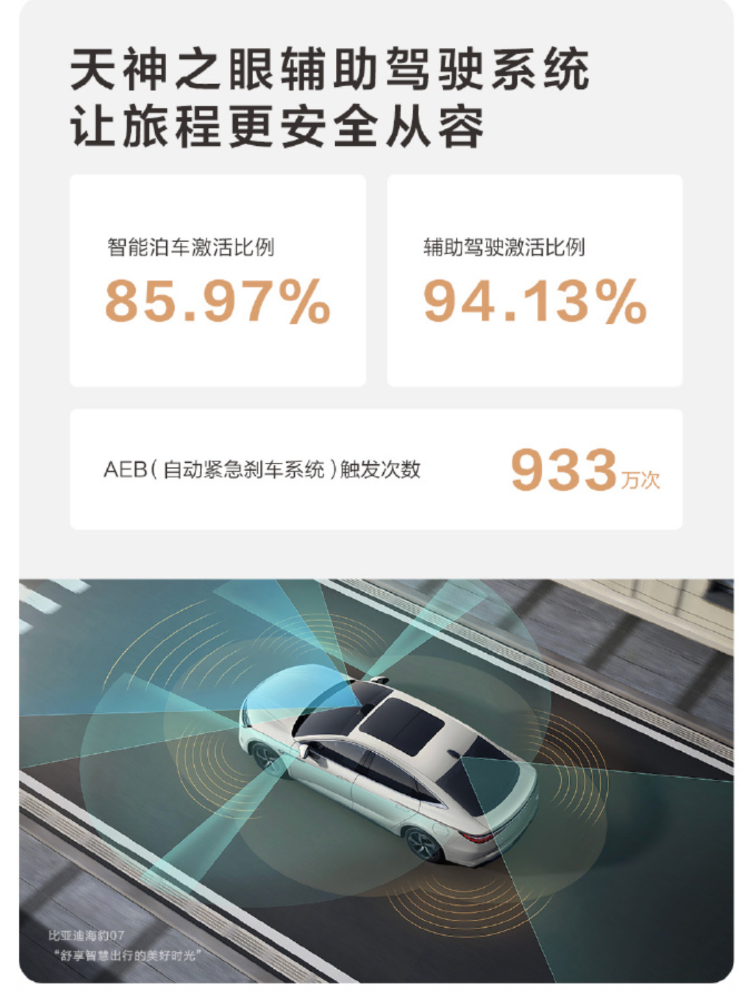 智能体验方面,DiLink智能座舱的数字钥匙解锁达57.9亿次、车机语音唤醒28.3亿次,地图导航、温度调节成高频交互场景。“天神之眼”辅助驾驶系统激活率超94%,AEB自动紧急刹车触发933万次,安全防护持续升级。