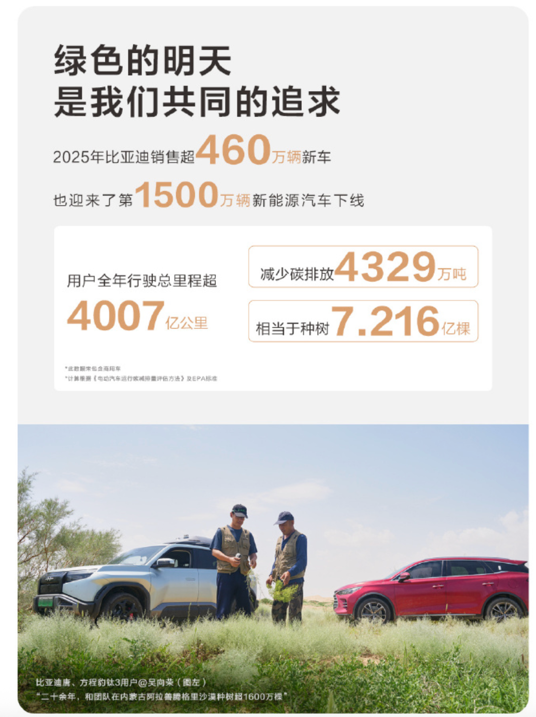凤凰网科技讯 1月12日,比亚迪汽车官方发布了2025比亚迪用户年度出行报告。报告提到,2025年比亚迪销售超460万辆新车,也迎来了第1500万辆新能源汽车下线。用户全年总行驶里程超4007亿公里,减少碳排放4329万吨,相当于种树7.216亿棵。