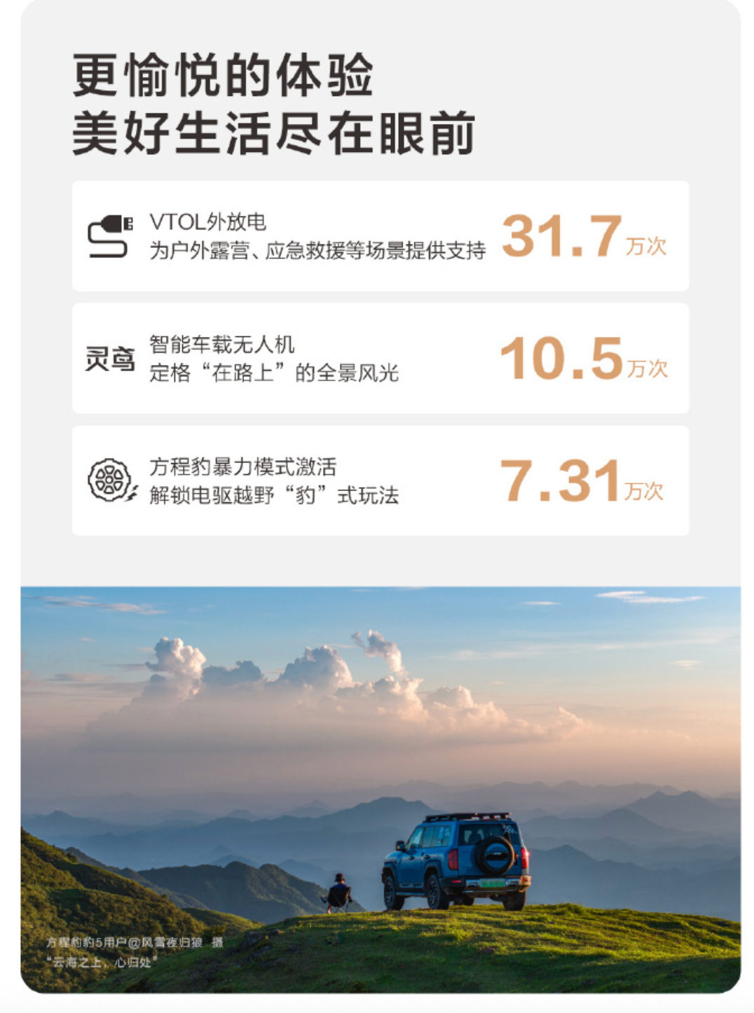 此外,VTOl外放电为露营等场景提供31.7万次支持,“灵犀”智能车载无人机定格10.5万次旅途风光,“腾势易方”“仰望易方”等高阶功能激活超2200万次。