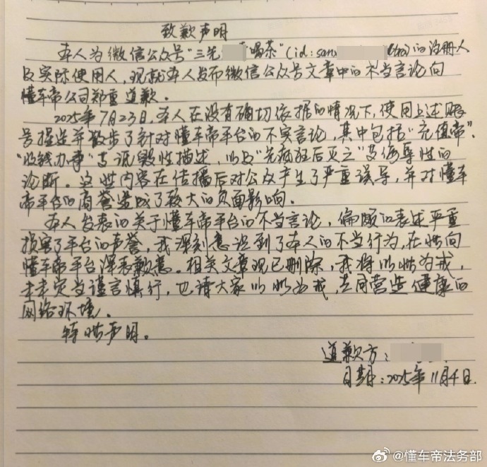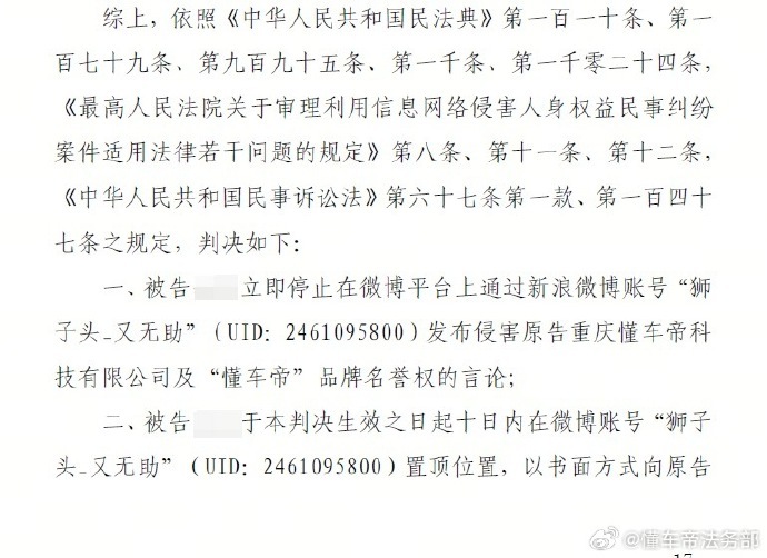 凤凰网科技讯 1月12日,懂车帝法务部发文透露了近期的维权进展。新浪微博用户“狮子头_又无助”在懂车帝辟谣之后,继续发布毫无事实依据,纯属捏造的言论。被叛微博置顶道歉10日,并赔偿懂车帝维权费用。
