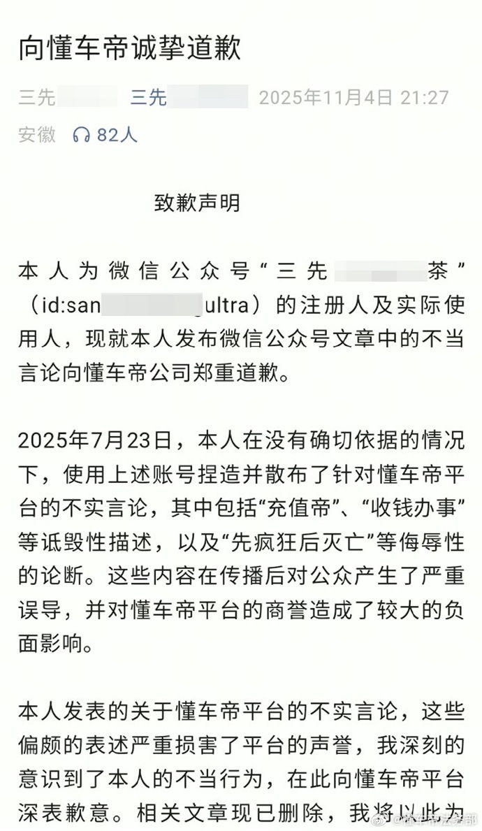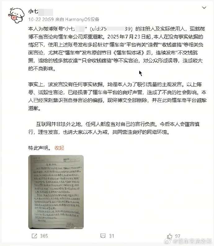 “小七***”、“三先***茶”发布多起针对“懂车帝”平台的有关“造假”“收钱瞎搞”“充值帝”等相关诽谤言论,现阶段,两名用户均已发布道歉声明,并置顶15日以上。
