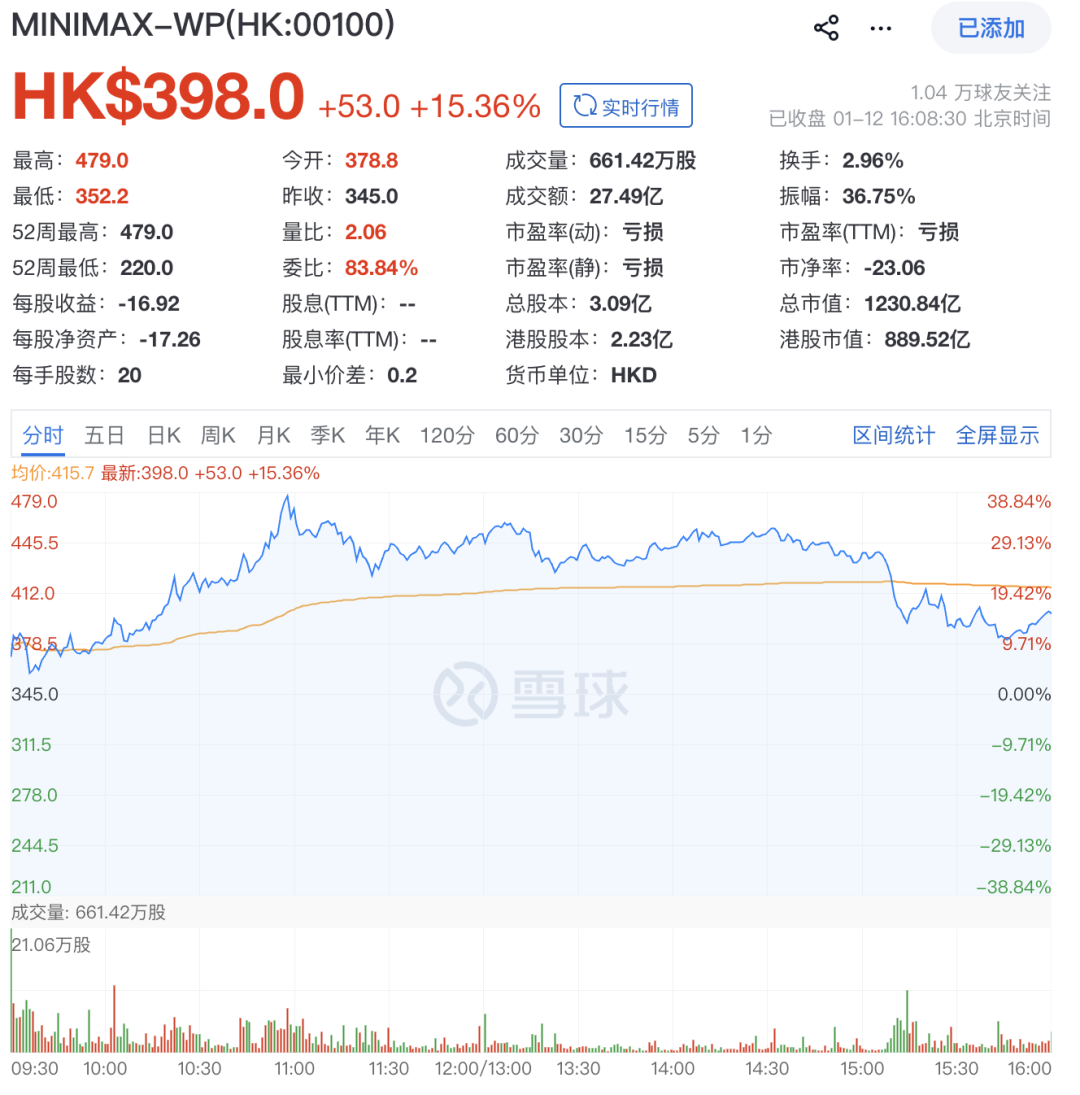 今日开盘,MiniMax依然是高开起手,最高涨至479港元,比发行价翻了将近三倍,收盘涨幅15.36%。