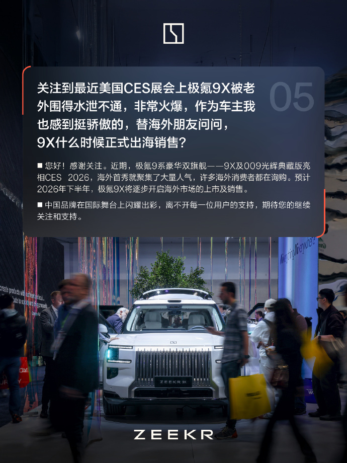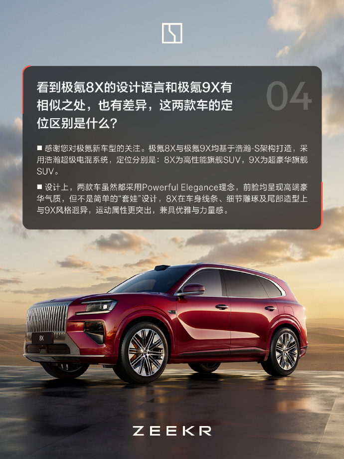 官方还提到,极氪8X与极氪9X均基于浩瀚-S架构打造,采用浩瀚超级电混系统,8X定位为高性能旗舰SUV,9X为超豪华旗舰SUV。此外,官方预计2026年下半年,极氪9X将逐步开启海外市场的上市及销售。