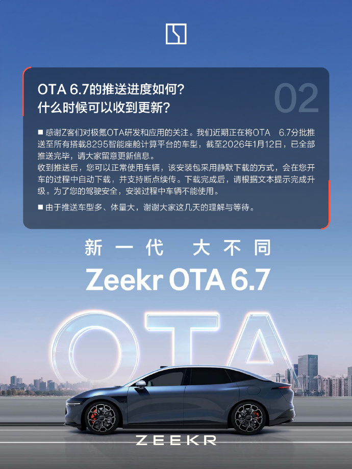 凤凰网科技讯 1月13日,极氪汽车官方在新一期的“你问我答”中提到,OTA6.7已全部推送至所有搭载8295智能座舱计算平台的车型。收到推送后,车主可以正常使用车辆,该安装包采用静默下载的方式,会在行车过程中自动下载,并支持断点续传。下载完成后,根据文本提示完成升级。值得注意的是,安装过程中车辆不能使用。
