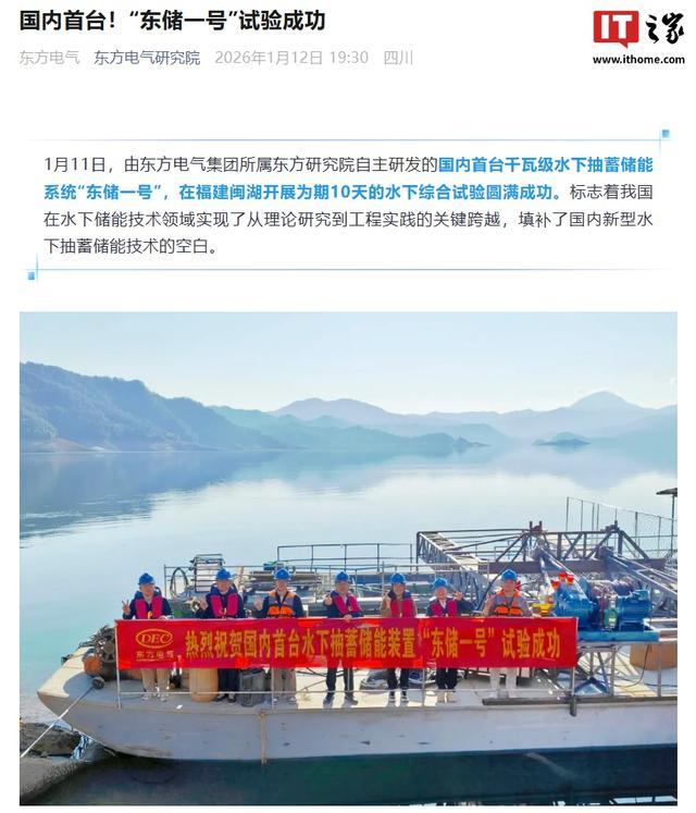 IT之家 1 月 13 日消息,东方电气研究院宣布,由东方电气集团所属东方研究院自主研发的国内首台千瓦级水下抽蓄储能系统“东储一号”开展为期 10 天的水下综合试验圆满成功。标志着我国在水下储能技术领域实现了从理论研究到工程实践的关键跨越,填补了国内新型水下抽蓄储能技术的空白。