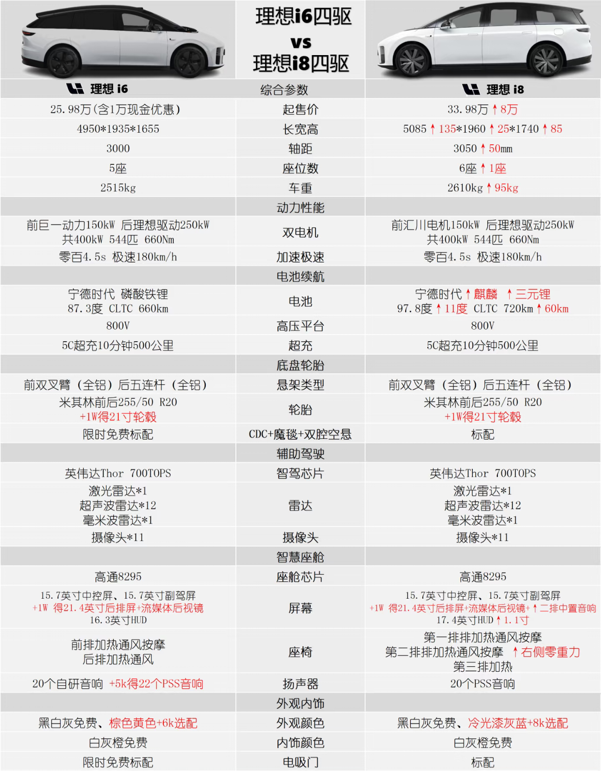 ▲ 理想 i6 和 i8 的配置对比 图源小红书