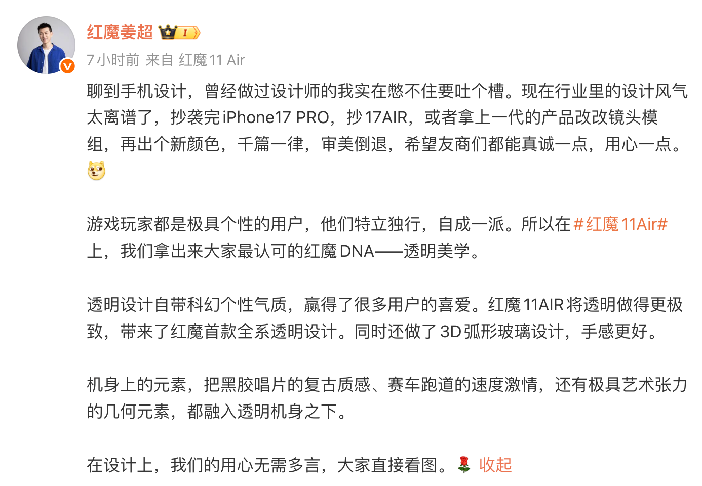 红魔产品经理吐槽手机设计:千篇一律,审美倒退 凤凰网科技讯 1月13日,红魔游戏手机产品总经理姜超发文批评行业抄袭风,称“抄完iPhone 17 Pro,抄Air,或者拿上一代的产品改改镜头模组,再出个新颜色,千篇一律,审美倒退,希望友商们都能真诚一点,用心一点。” 据了解,红魔将于1月20日发布的红魔11Air,宣称首次实现“全系透明设计”。 Published by 风君子 独自遨游何稽首 揭天掀地慰生平 View all posts by 风君子