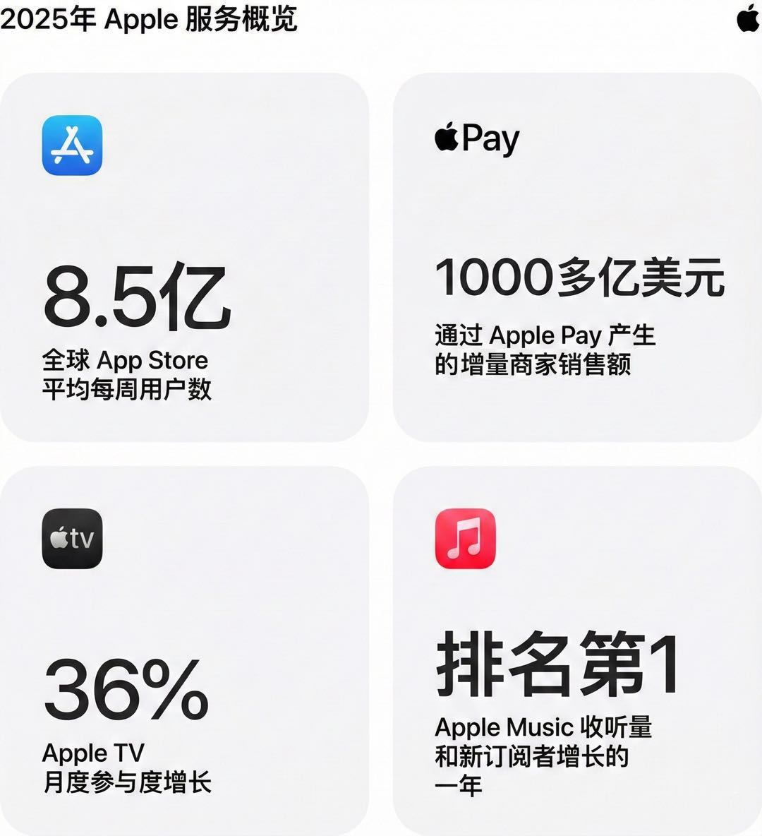 苹果表示,2025 年是其服务业务的「破纪录之年」。App Store、Apple Music、Apple Pay、iCloud、Apple 播客等核心服务均实现显著增长,并在节假日期间迎来用户访问与消费高峰。