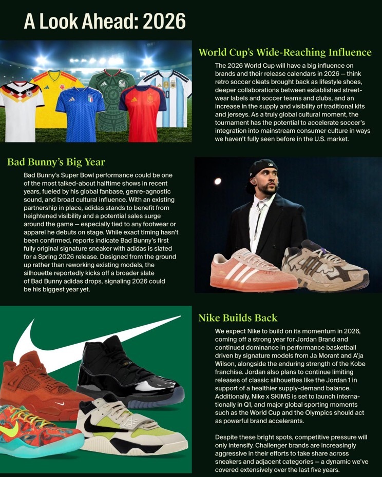2026 年世界杯预计将进一步提升足球文化在美国的影响力,而米兰奥运会则可能推动运动与时尚的跨界合作。Bad Bunny 也将在今年迎来关键节点,包括超级碗中场秀与首款阿迪达斯原创签名鞋的发布。