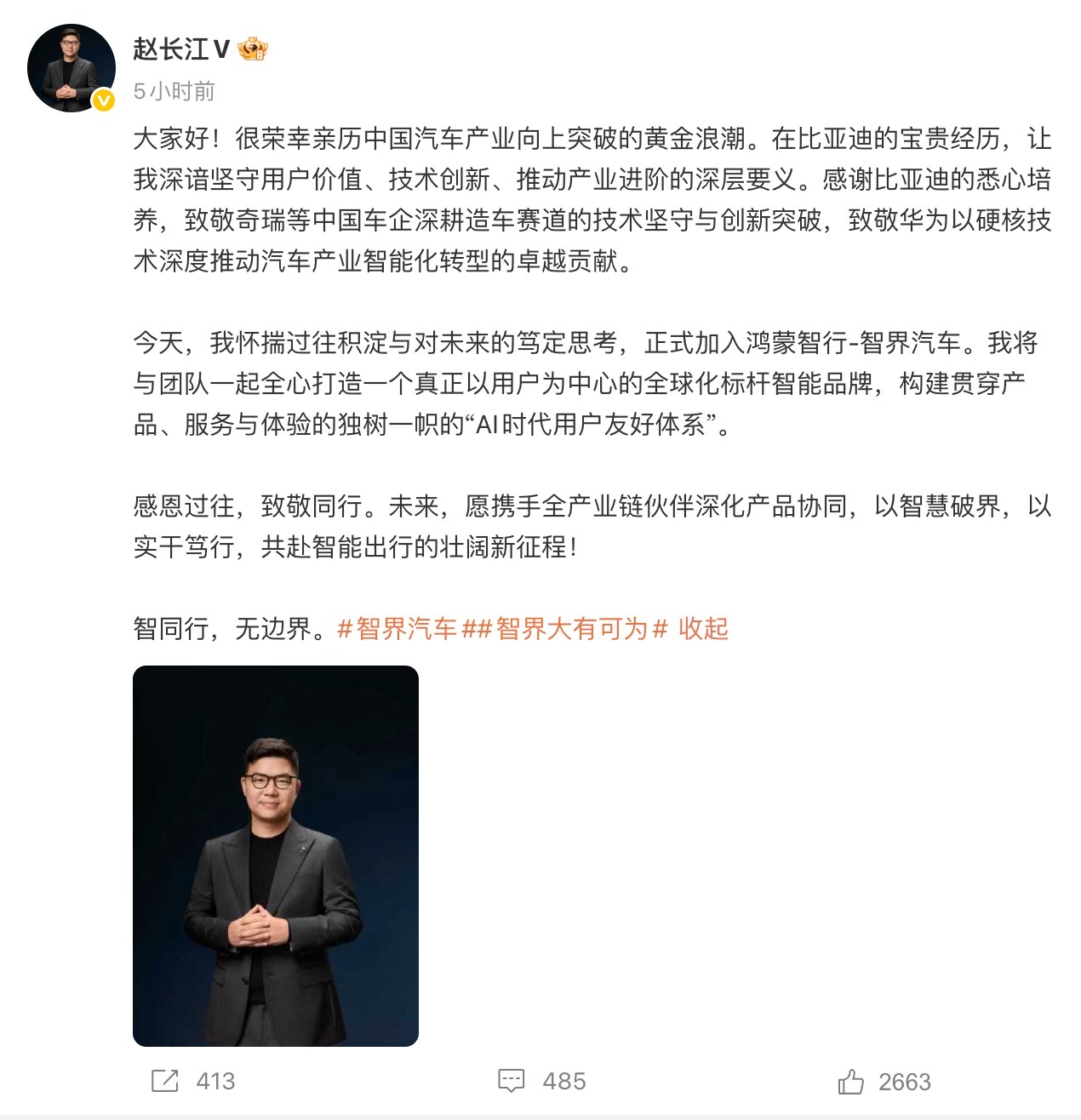 昨天,前比亚迪高管赵长江宣布加入鸿蒙智行旗下智界汽车,出任智界汽车执行董事及执行副总裁,其微博认证也已同步更新。