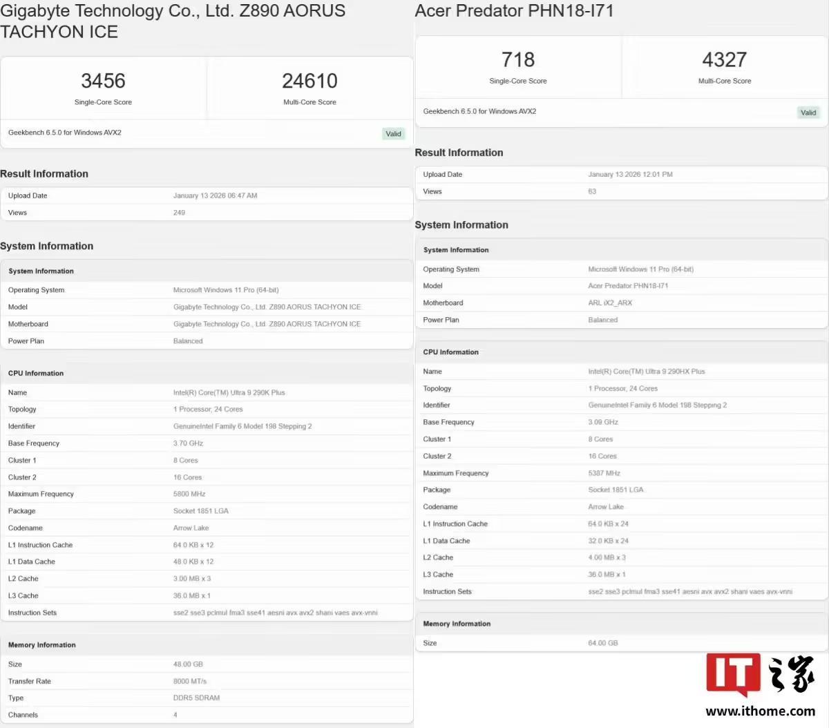 IT之家 1 月 14 日消息,Geekbench 基准测试数据库昨日记录到了两款英特尔旗舰 "Arrow Lake Refresh" 处理器,分别是桌面端的酷睿 Ultra 9 290K Plus 和移动端的酷睿 Ultra 9 290HX Plus。IT之家注意到,后者的存在也证实了铭凡早前的泄露。