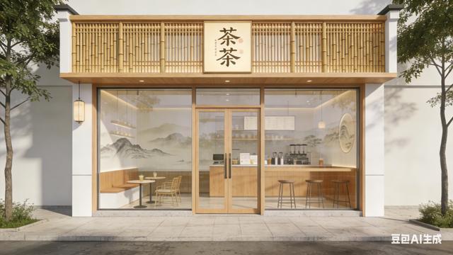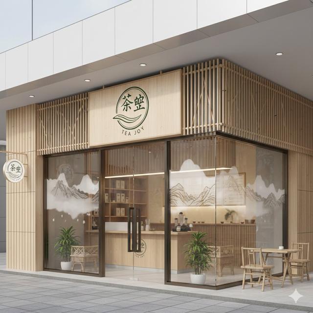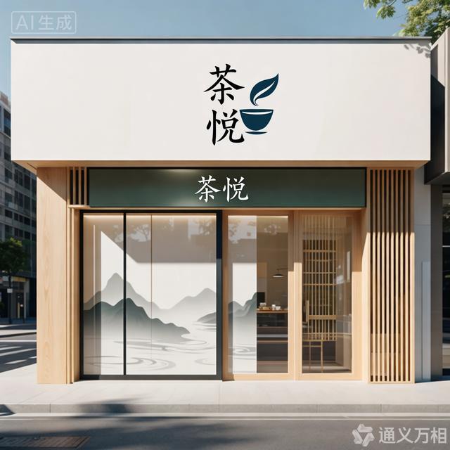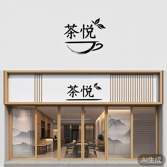 生成建议:“茶悦”二字可以尝试用细笔触的行书,搭配一个抽象的茶杯或茶叶形状。店铺外观可以是浅木色和留白为主,用竹格栅做装饰,玻璃上若有若无地映出山水画痕迹。