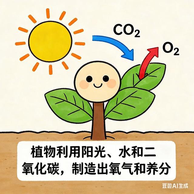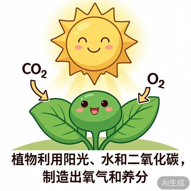 画一张给小学生看的“光合作用示意图”。图中需要包含一棵有笑脸的植物、一个大太阳、代表二氧化碳(CO₂)的箭头从空气指向叶子、代表氧气(O₂)的箭头从叶子中冒出。在图片下方,用清晰易懂的字体标注解释:“植物利用阳光、水和二氧化碳,制造出氧气和养分”。整体风格需生动可爱,兼具科学性和趣味性。