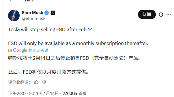 凤凰网科技讯(作者/于雷、云飞) 1月14日,特斯拉CEO马斯克在社交媒体平台X发帖表示,特斯拉将在2月14日后停止销售FSD。此后,FSD将仅以月度订阅的形式提供。