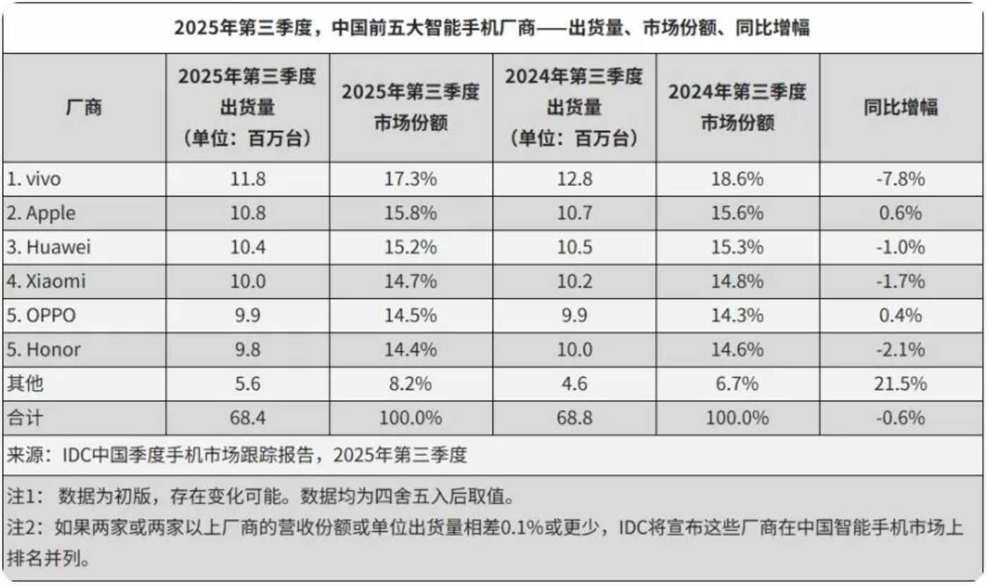 根据Counterpoint最新发布的数据,2025年全球智能手机出货量同比微增2%,苹果以20%的市场份额超越三星,时隔14年重返全球第一宝座,小米、vivo、OPPO分列3-5位。