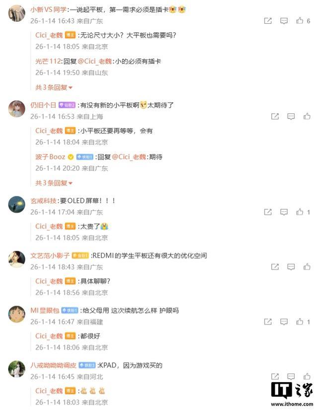 IT之家注意到,有网友询问有没有新的小平板,称太期待了,魏思琪回复:“小平板还要再等等,会有。”这表明小米 / REDMI 后续将继续推出小平板产品。