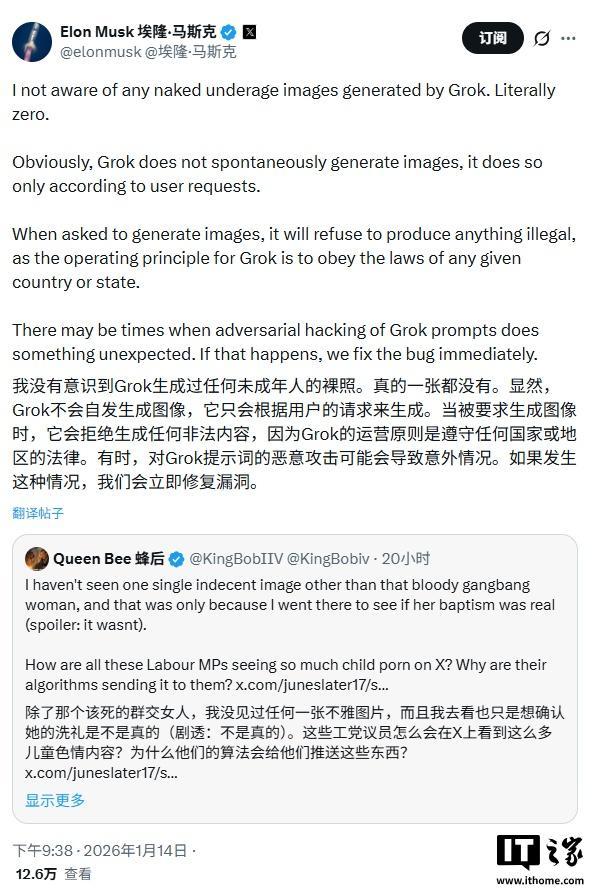 IT之家 1 月 14 日消息,马斯克今日在社交平台 X 上发帖称,其没有发现任何由 Grok 生成的未成年人裸照。