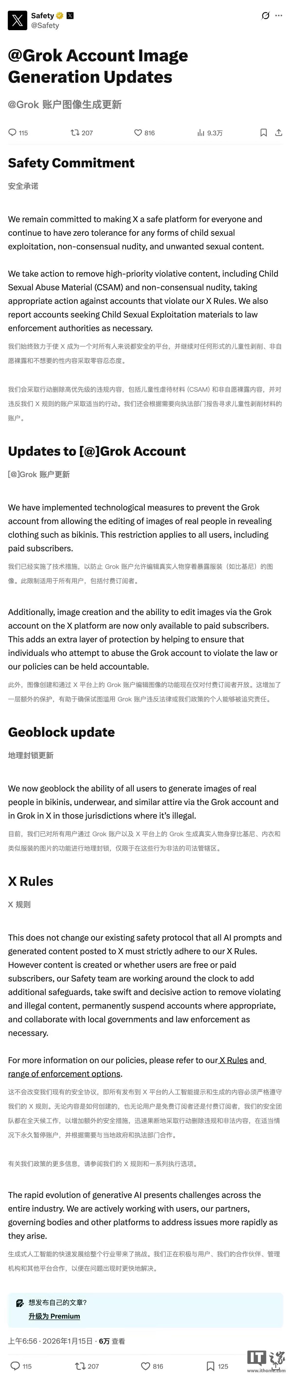 IT之家 1 月 15 日消息,在 Grok 被持续指控生成涉及儿童的“性化”图像及未经同意裸露内容、并引发数周舆论压力后,X 宣布收紧 Grok 的图像编辑与生成功能。