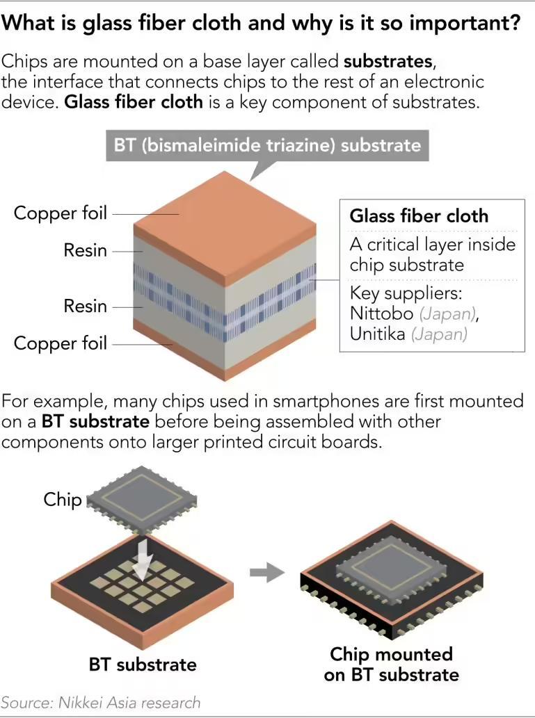 IT之家注:玻璃纤维布是一种像厚实保鲜膜一样的材料,编织得极细(比头发还细),是制造电路板的“骨架”,负责支撑芯片并传输信号。在本文中特指高端的 T-glass,这种玻璃受热不易变形,适合高性能 AI 芯片和高端手机处理器。