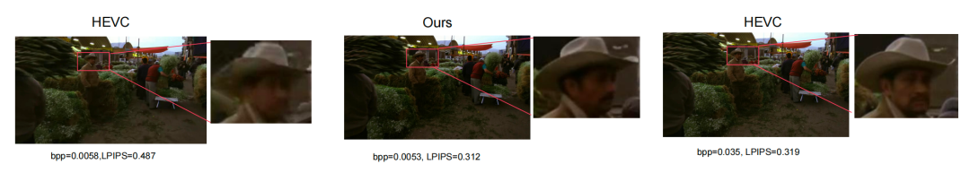 传统霸主HEVC已经彻底崩溃,画面基本是马赛克乱舞,LPIPS数值飙升(越低越好)。