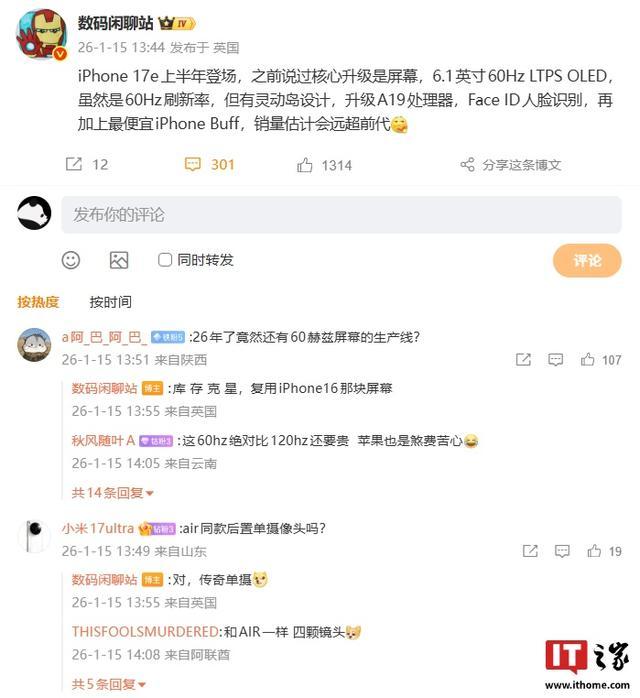 有网友感叹 26 年了竟然还有 60Hz 屏幕的生产线,博主回复称:“库 存 克 星,复用 iPhone 16 那块屏幕。”还有网友询问 iPhone 17e 是否为 Air 同款后置单摄?博主直言:“对,传奇单摄。”