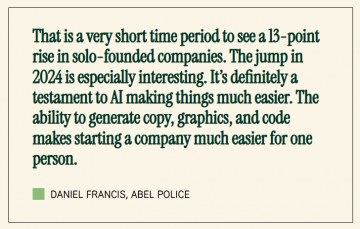 根据 Carta 2025 年的最新数据,超过三分之一的新公司是由单人创始人创办的。