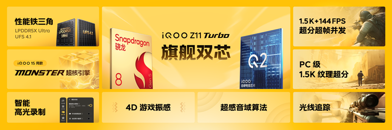 凤凰网科技讯 (作者/杨睿琪、王睿)1月16日,iQOO发布新款智能手机Z11 Turbo。该机搭载了第五代骁龙8移动平台与自研电竞芯片Q2的双芯组合,后置主摄像素为2亿。官方建议零售价2699元起。