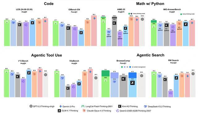 美团表示,经过全面严谨的评估显示,LongCat-Flash-Thinking-2601 模型在编程、数学推理、智能体工具调用、智能体搜索维度表现全面领先: