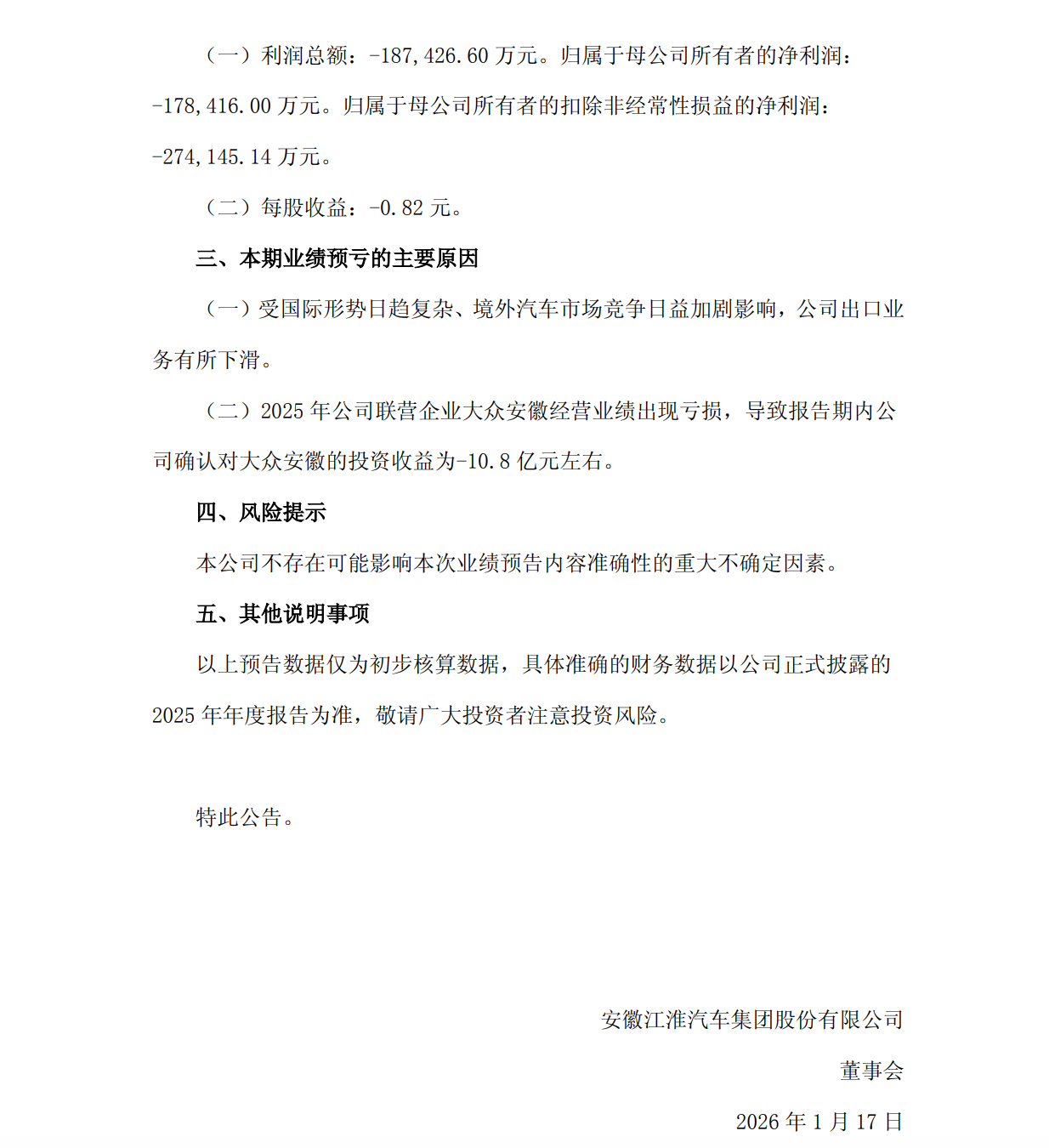 江淮汽车:预计2025年净亏损16.8亿元左右 凤凰网科技讯 1月16日,江淮汽车(600418.SH)发布2025年度业绩预告,预计归属于母公司所有者的净亏损16.80亿元左右,上年同期为亏损17.84亿元。报告期内,受国际形势日趋复杂、境外汽车市场竞争日益加剧影响,公司出口业务有所下滑;2025年公司联营企业大众安徽经营业绩出现亏损,导致报告期内公司确认对大众安徽的投资收益为亏损10.8亿元左右。 Published by 风君子 独自遨游何稽首 揭天掀地慰生平 View all posts by 风君子