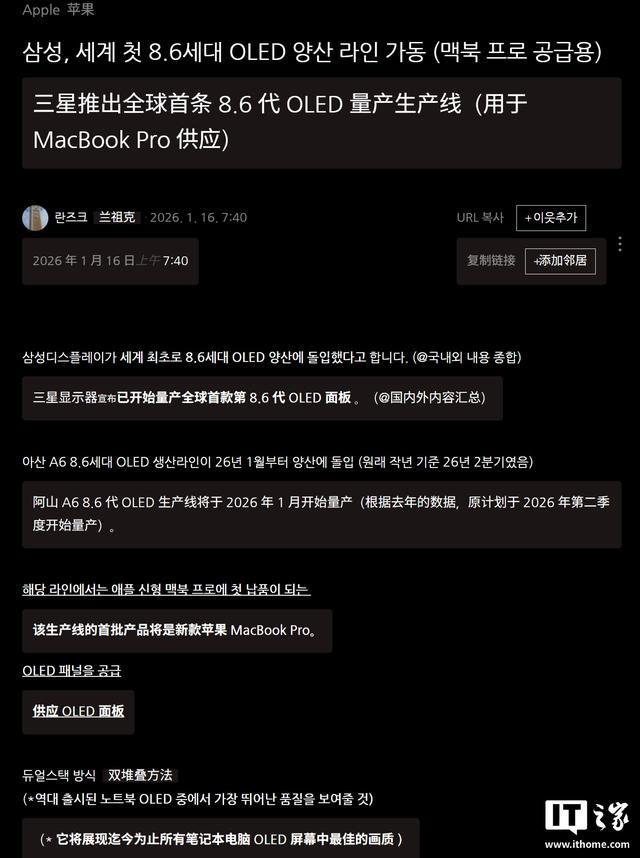 IT之家 1 月 17 日消息,消息源 yeux1122 昨日(1 月 16 日)发布博文,爆料称三星显示(Samsung Display)为苹果的 MacBook Pro,将于 1 月 26 日启动 8.6 代 OLED 面板量产,早于业界预估的 2026 年第 2 季度。