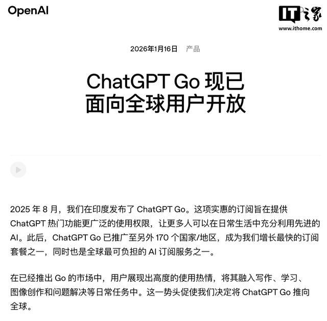 IT之家 1 月 17 日消息,OpenAI 的低价订阅方案 ChatGPT Go 现已正式推向美国及全球市场。该方案最早于去年 8 月在印度上线,随后覆盖 170 个国家,并在北京时间今天凌晨宣布面向全球范围开放。