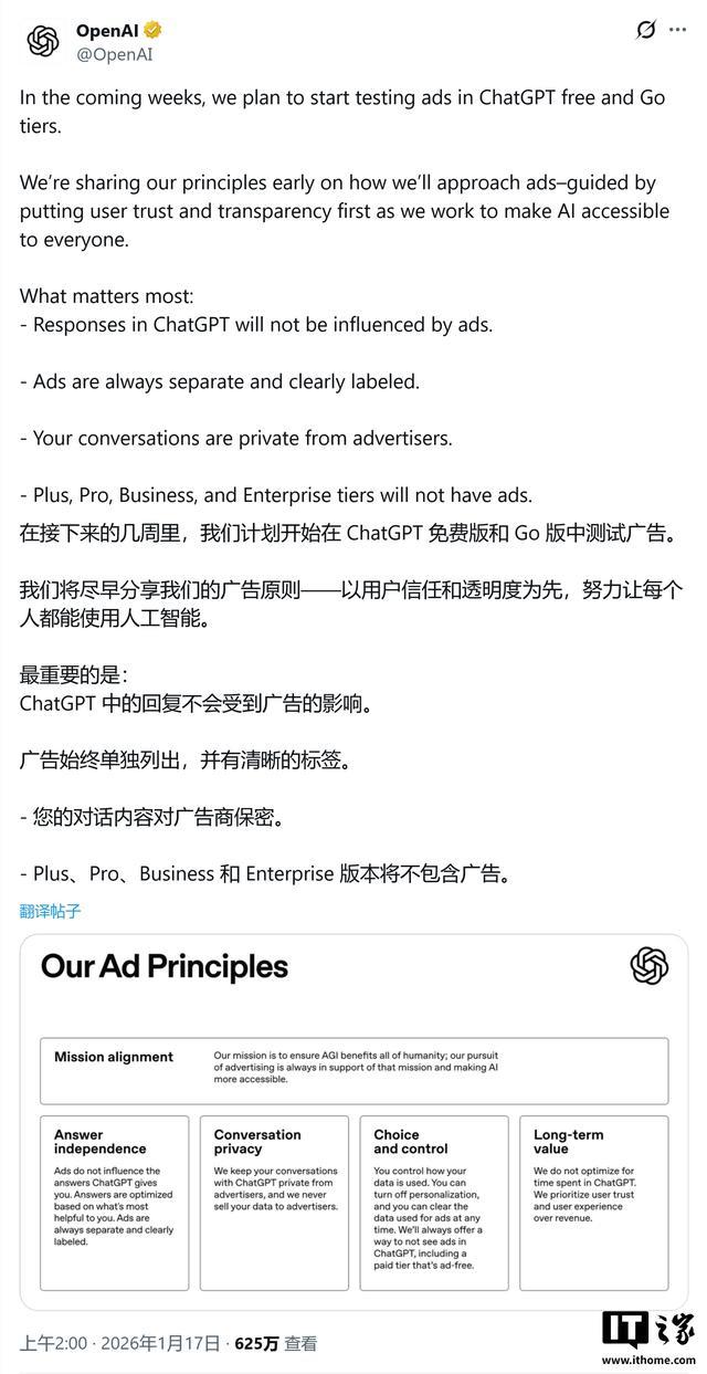 OpenAI 明确表示,广告将以独立模块的形式出现,极有可能置于 AI 生成答案的底部,并会进行清晰的标签化处理,确保用户能一眼区分“AI 回答”与“推广内容”。IT之家附上官方推文截图如下: