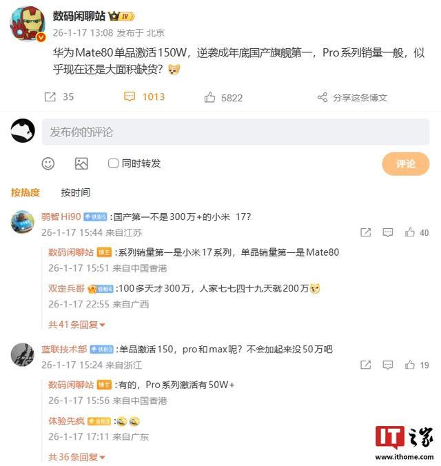 IT之家 1 月 18 日消息,博主 @数码闲聊站 昨日发文透露,华为 Mate 80 单品激活 150W,逆袭成年底国产旗舰第一。