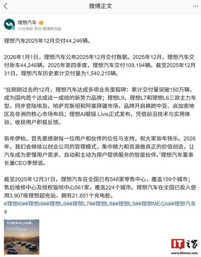 据IT之家此前报道,本月早些时候,理想汽车官方宣布累计交付量突破 150 万辆,成为国内首个达成这一成绩的新势力品牌。截至 2025 年 12 月 31 日,理想汽车历史累计交付量为 1,540,215 辆。