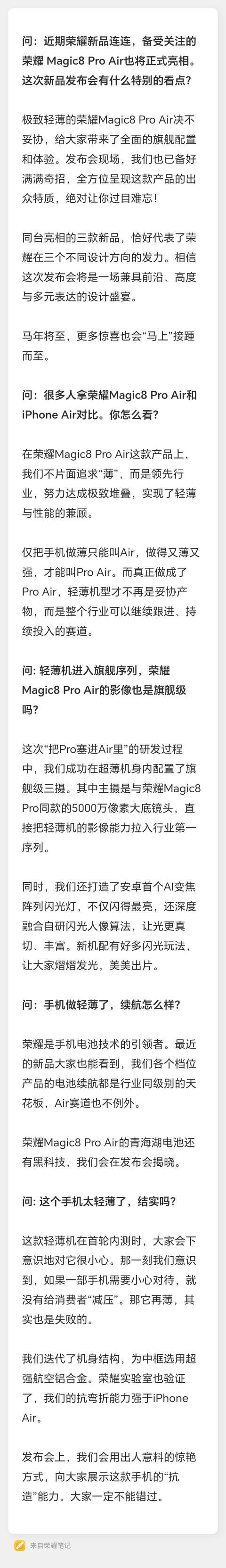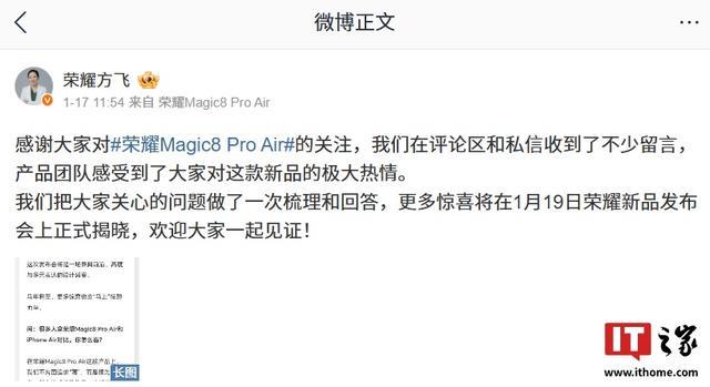 IT之家 1 月 18 日消息,荣耀终端股份有限公司产品线总裁方飞昨日发文梳理和回答了网友关心的问题,包括新品发布会看点、Magic8 Pro Air 影像能力 / 续航能力 / 机身结构强度等。