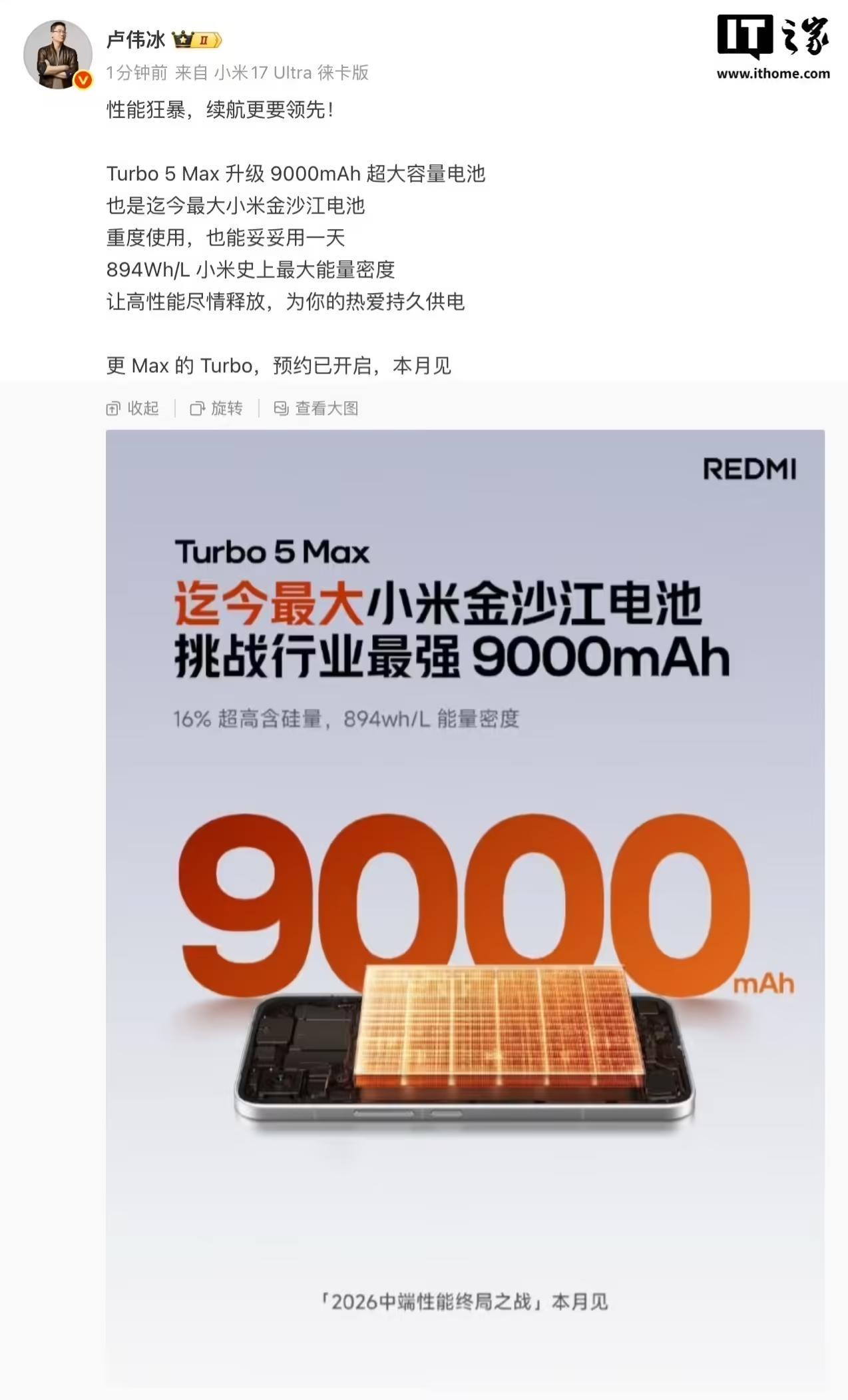小米REDMI Turbo 5 Max手机外观公布:金属中框、双环涡轮灯带,号称REDMI最具旗舰质感性能机 IT之家 1 月 19 日消息,REDMI 红米手机官方今日公布了小米 REDMI Turbo 5 Max 的外观,新机号称 REDMI 最具旗舰质感的性能机,设计细节如下: 优雅大 R 角 + 极窄边框 CNC 金属中框 + 旗舰玻纤背板 金属跑道型 Deco + 双环涡轮灯带 新色海风蓝 据IT之家今日稍早时候报道,小米集团合伙人、总裁、手机部总裁、小米品牌总经理卢伟冰发文宣布,REDMI Turbo 5 Max 升级 9000mAh 超大容量电池,也是迄今最大小米金沙江电池,重度使用也能妥妥用一天,具有 894Wh/L 小米史上最大能量密度。 Published by 风君子 独自遨游何稽首 揭天掀地慰生平 View all posts by 风君子