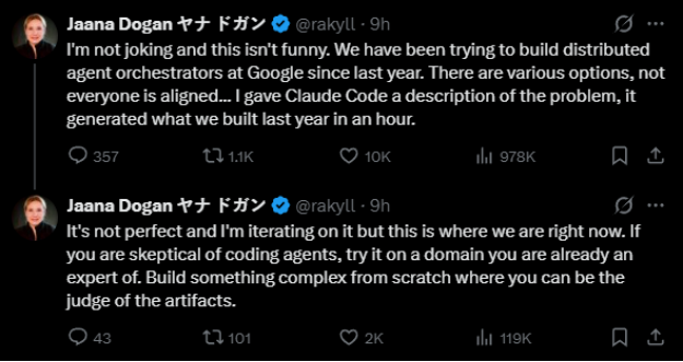 谷歌首席工程师、Gemini API负责人Jaana Dogan公开表示,她只用几句提示词、一个多小时,就借助Claude Code完成了相当于过去一年工作量的成果。