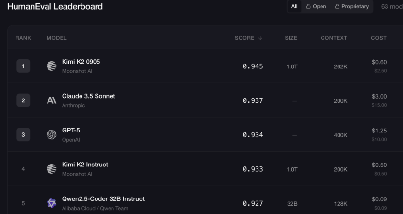 Human Eval排名前五的模型分别来自于Kimi、Anthropic、OpenAI、阿里。