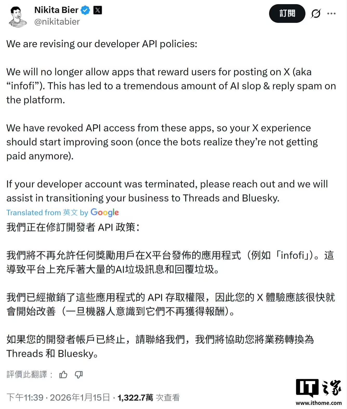 IT之家 1 月 19 日消息,X 平台(前 Twitter)产品经理 Nikita Bier 本周(1 月 15 日)宣布,将修改开发者 API 政策。