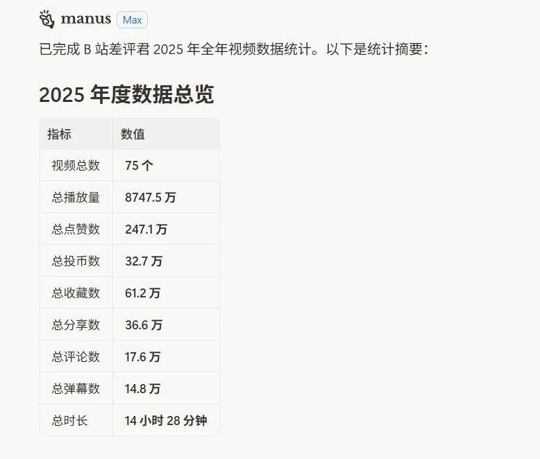 我们又用 Manus 1.6 Max 试了试同样的任务,结果 Manus 只统计出了 75 个视频的相关数据,总数都对不上,别的更别提了。