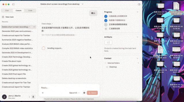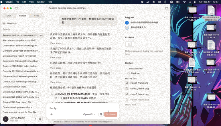 作为一个究极 J 人,世超的桌面本来是相当干净的。只不过今天为了测评 Cowork 多出来不少录屏,系统默认按时间命名,堆一起实在有点难绷。