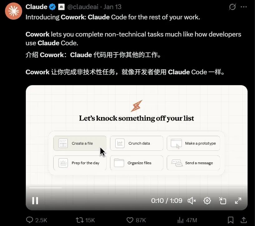 更绝的是,Anthropic 还自爆 Cowork 内含 100% AI 代码,没有一点人工,只用 10 天就搓出来了。