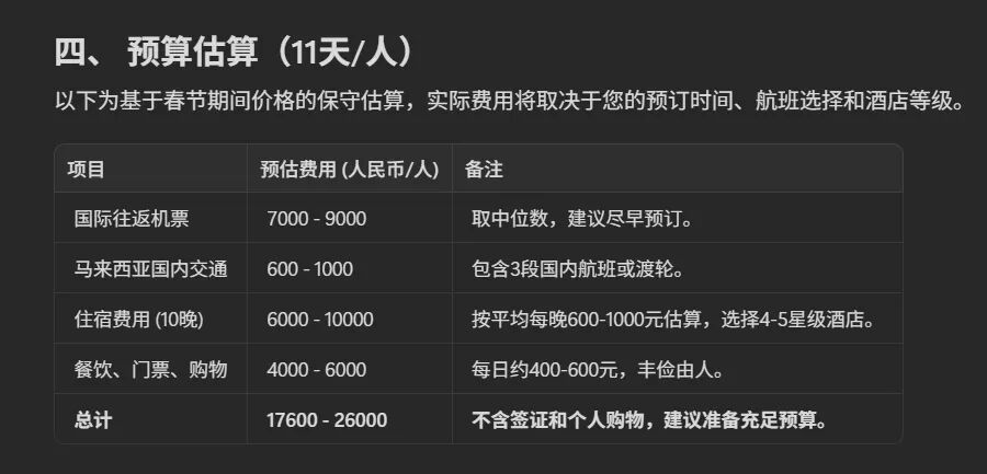 相比起来,Manus 的行程预算偏高,但更接近春节出行的真实价格。