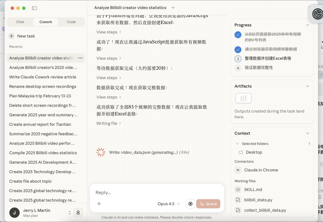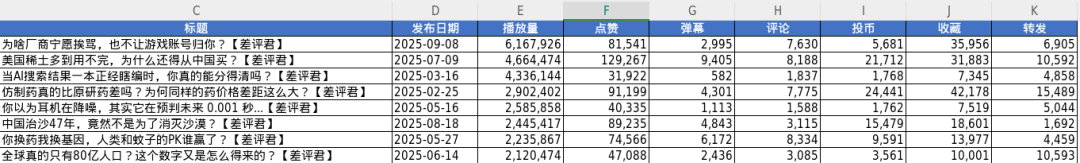 十五分钟后,它默默返回了一个 Excel,里面的数据不仅包含一整年的所有 83 个作品,而且每条播放量、点赞、弹幕数、评论、投币、收藏、转发,全对。