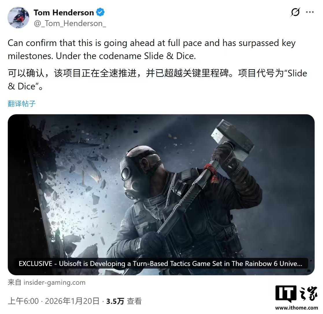 IT之家 1 月 20 日消息,消息源 Tom Henderson 今天(1 月 20 日)在 X 平台发布推文,透露育碧(Ubisoft)正全速推进开发代号为“Slide & Dice”,该游戏项目定位为基于《彩虹六号》宇宙的回合制战术游戏。